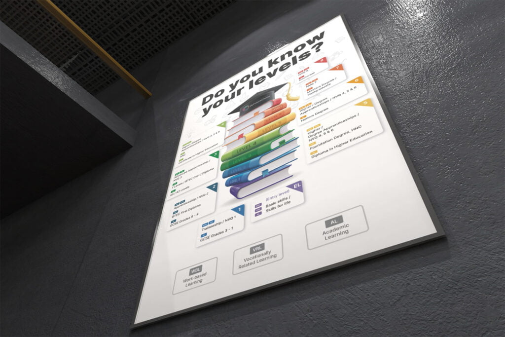Designed for all school ages, including sixth forms and colleges, this poster outlines the different levels of education, showing options for Work-Based Learning, Vocational-Related Learning, and Academic Learning. It’s an ideal tool to help students envision their progression towards higher levels of education.