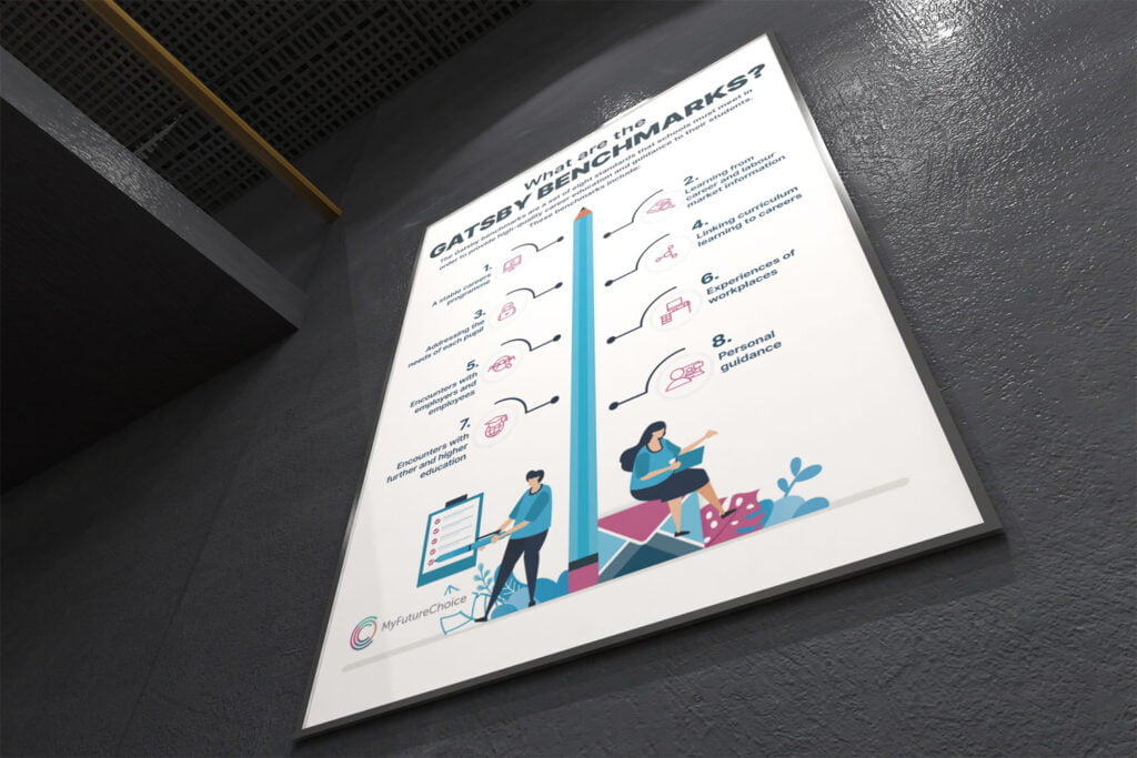 Perfect for careers leaders and educators alike, this poster presents the 8 Gatsby Benchmarks in a reader-friendly design. Display it in your office, or use it to introduce staff and headteachers to the Gatsby Benchmarks, key parameters for good career guidance.