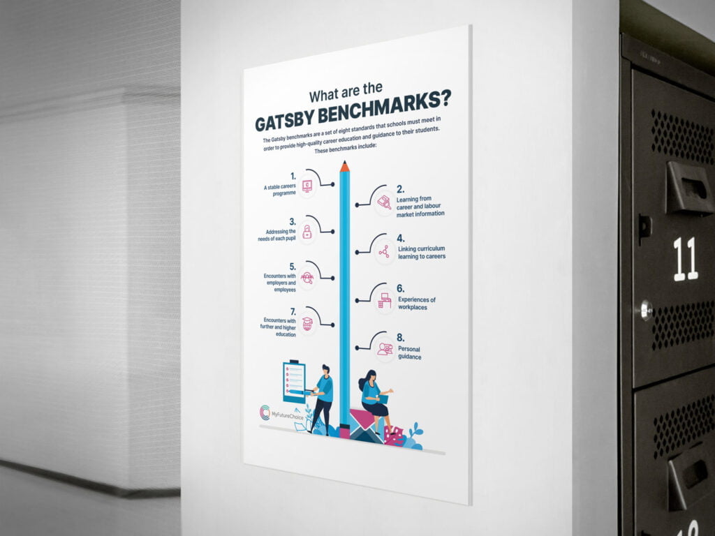 You’ll find that each careers poster is ideal to display in your school or college and are designed to be printed at A1 size for classroom display or as smaller handouts. This careers poster pack 1 include 4 designs all aimed at different age groups. We also included a bonus Gatsby Benchmark poster ideal for careers professionals to use to help the whole organisation understand the different benchmarks. All are available for you to download and print, whether that’s in school or at a local printing service.