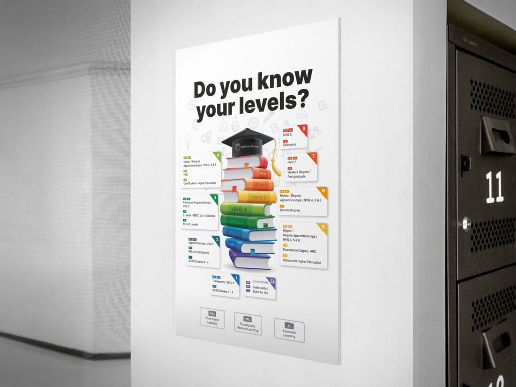 Designed for all school ages, including sixth forms and colleges, this poster outlines the different levels of education, showing options for Work-Based Learning, Vocational-Related Learning, and Academic Learning. It’s an ideal tool to help students envision their progression towards higher levels of education.